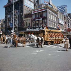 Shortly after the Second World War, in 1947, it was decided to get rid of the eight horses still in active service in the Heineken brewery in Rotterdam, as there were enough lorries available. But in Amsterdam, the same year, it was decided otherwise: the Board of Directors there were almost unanimously of the opinion that while ‘horse-drawn transport is expensive, it is entirely sensible to maintain this traditional advertisement’. When a few decades later Heineken took over the Amstel brewery, in addition to the Heineken drays the Amstel dray, with the characteristic high canopy above the box, was also retained in use for advertising purposes.
