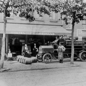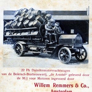 Before the arrival of the automobile, Amsterdam’s street scene was largely set by the horse-and-cart, barrows and coaches. Casks of beer were also delivered to the various cafés by the horse-drawn beer wagon, the brewers’ dray. Around 1900 the Heineken brewery bought the first motorized lorry and in 1907 Chris van Eijk, head of Dispatch, posed in the Amstel brewery’s first automobile, a 22 PK Daimler, in front of the café ‘Anton van Vuuren’ on the Ceintuurbaan in Amsterdam.