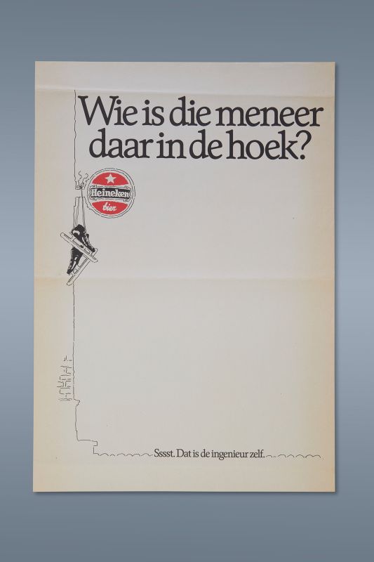 Twee mannen, tot aan hun hoge witte boorden strak in het pak, poseren aan een cafétafeltje voor Heineken’s Bier. Op tafel de…