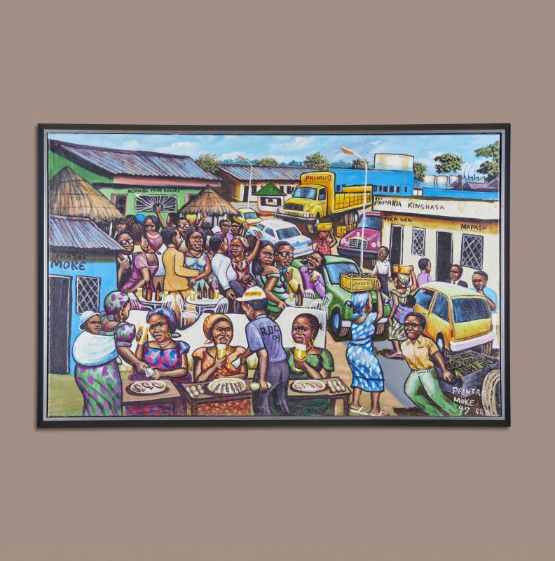 Je komt ogen tekort bij dit schilderij van een straattafereel in Kinshasa. Links dansen Congolese mannen en vrouwen op een…
