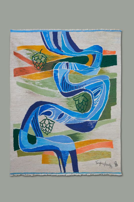 Het is de abstracte impressie van een slingerende rivier door een heuvellandschap met drie hopbellen. De symboliek? De rivier is…